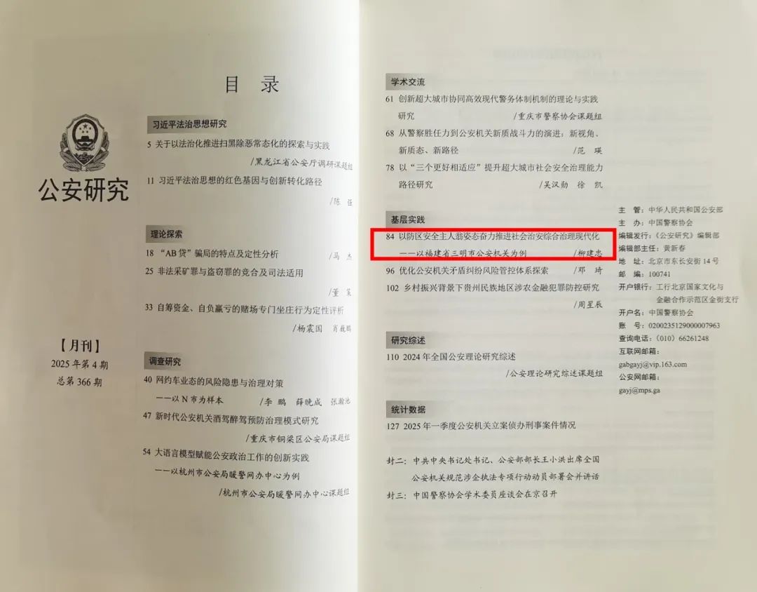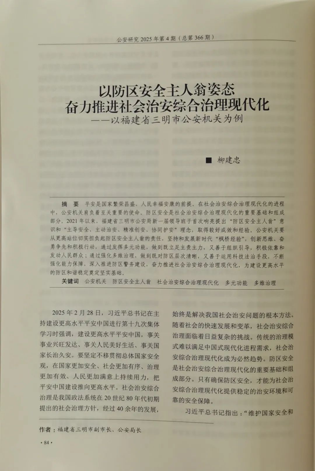 近日,公安部主管、中国警察协会主办的《公安研究》杂志2025年第4期(总第366期)刊发三明市副市长、公安局长柳建忠署名文章《以防区安全主人翁姿态 奋力推进社会治安综合治理现代化——以福建省三明市公安机关为例》。