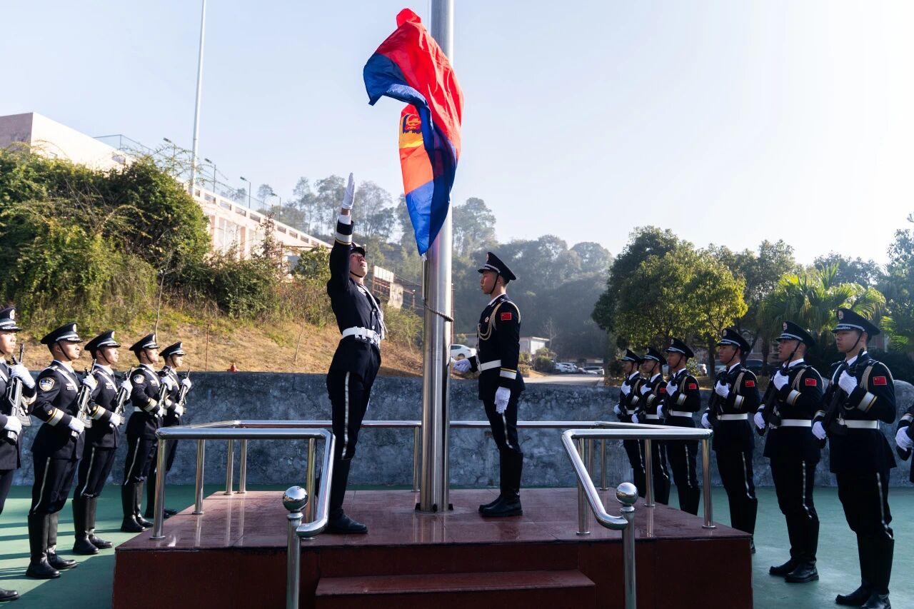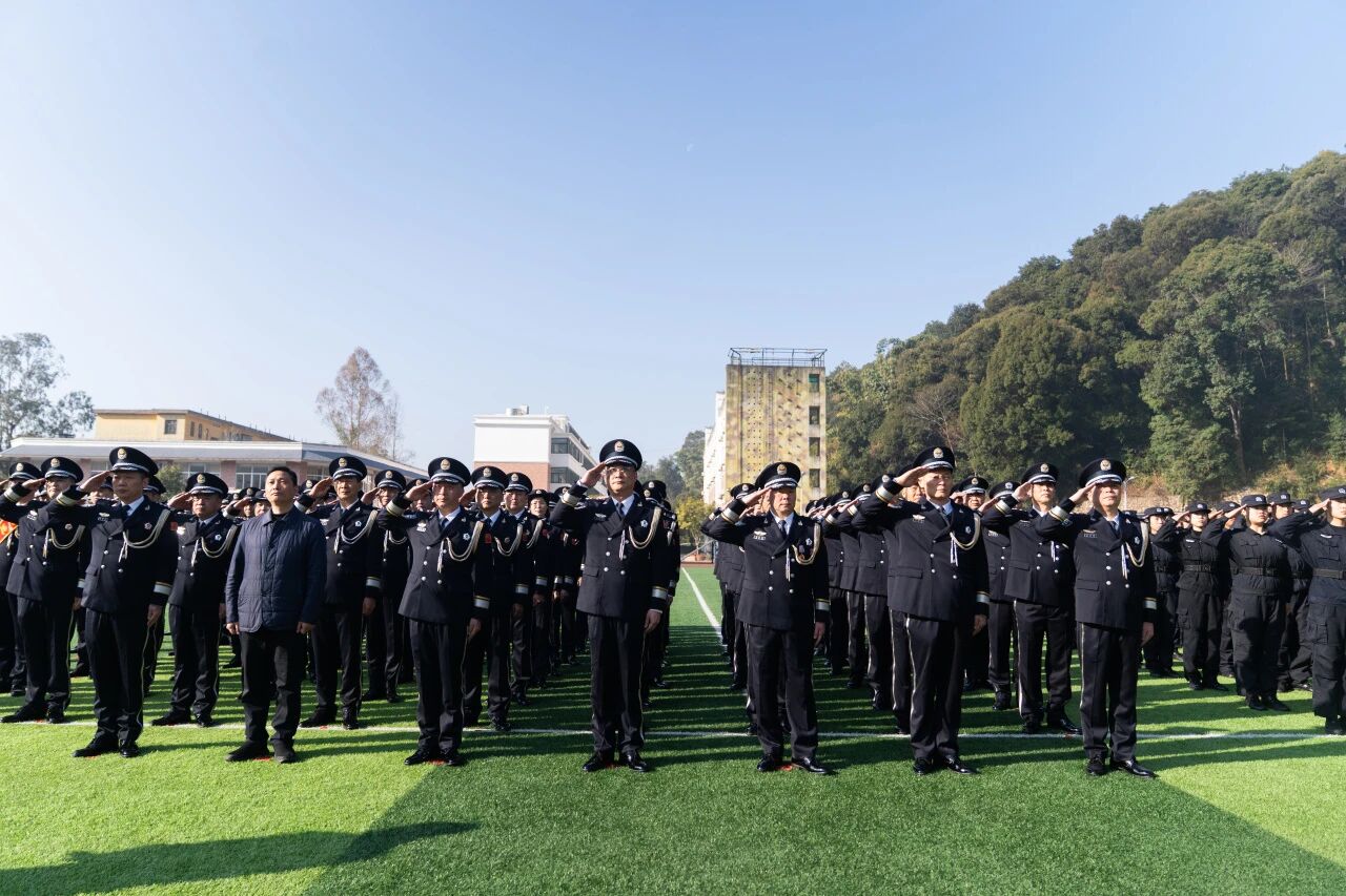 上午9时30分,升警旗仪式正式开始!18名仪仗队员护卫着警旗昂首入场,激昂的警歌声中,警旗冉冉升起,全体人员肃立敬礼。