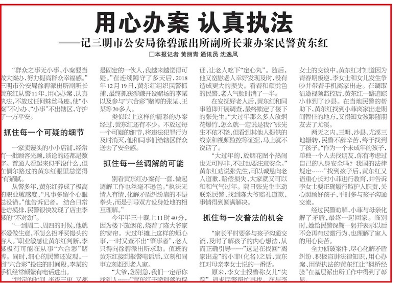 3月22日,《福建法治报》以“用心办案 认真执法”为题,报道徐碧派出所副所长黄东红的警察故事,原文转载如下: