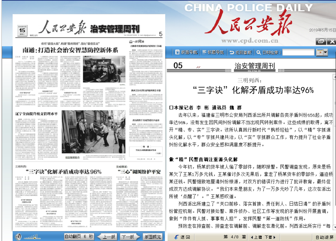 去年以来,福建省三明市公安局列西派出所共调解各类矛盾纠纷656起,成功率达96%,没有发生因民间纠纷调解不当出现民转刑案件。这些成绩的取得,离不开“精、专、实”三字诀。该所认真践行新时代“枫桥经验”,以“精”字抓源头化解,以“专”字抓共建共治,以“实”字抓群众工作,有力提升了社会矛盾纠纷化解水平,群众安全感和满意度不断提升。