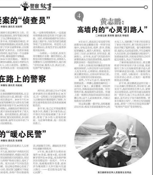 27年来,黄志鹏就是这样日复一日认真履行管教职责,恪尽职守,踏实肯干;他时刻牵挂在押人员,紧密关注思想动态,是所里沟通交流疏导的一把好手;他工作认真负责,清正廉洁,是不法分子攻不破的铁桶。曾多次被省公安厅、三明市公安局通报表扬,获得“三明市百佳监管民警”“优秀共产党员”等荣誉称号。