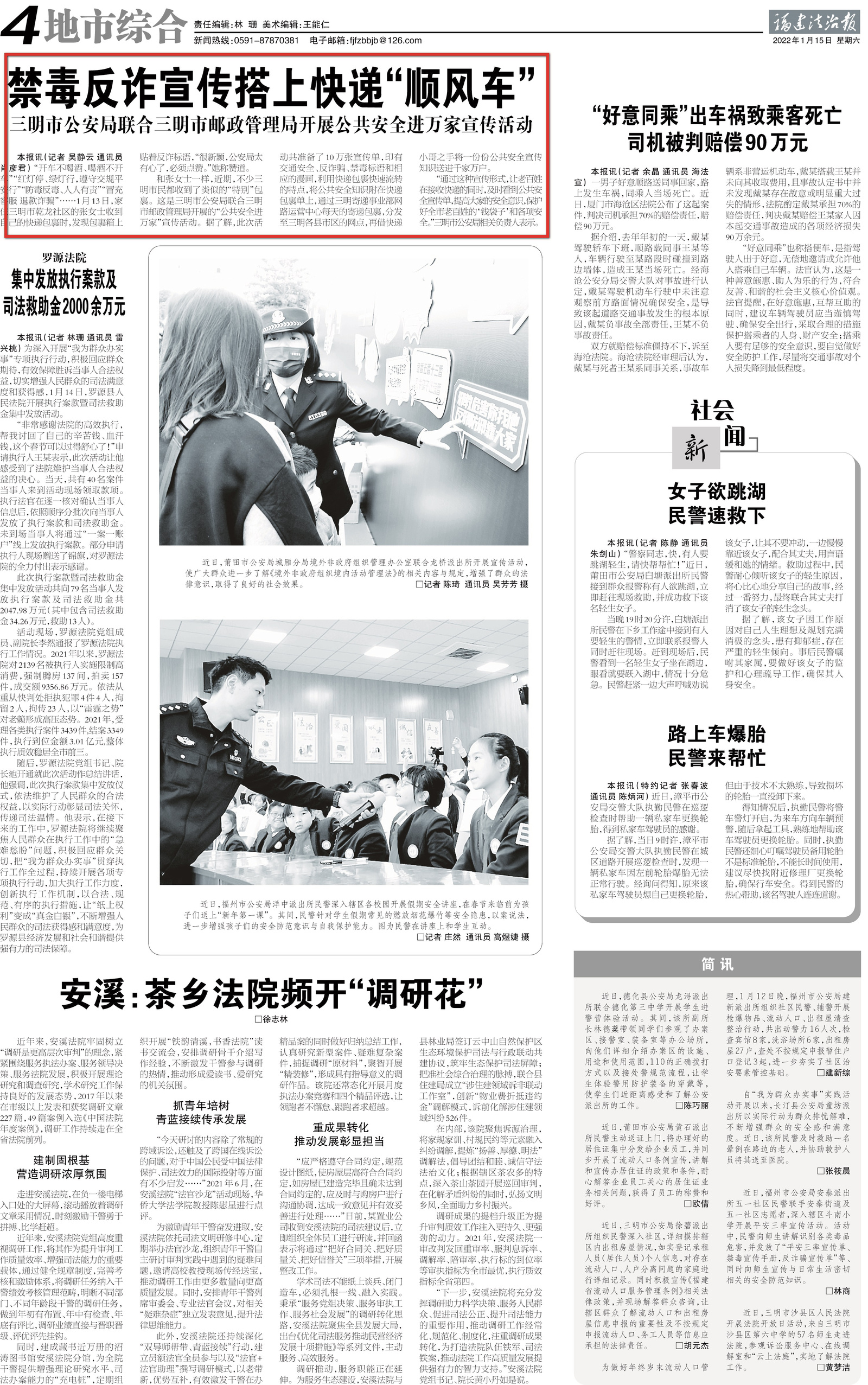 为有效提高公共安全宣传受众人群覆盖面,进一步增强三明百姓的公共安全意识,提高安全防范能力,1月12日下午,三明市公安局联合三明市邮政管理局举行公共安全进万家宣传启动仪式。本次活动主要通过快递包裹粘贴印有“交通安全、反诈骗及禁毒标语”宣传单的形式,利用快递包裹快速流转的特点,将公共安全知识附在快递包裹单上,“送货上门”走进千家万户中。