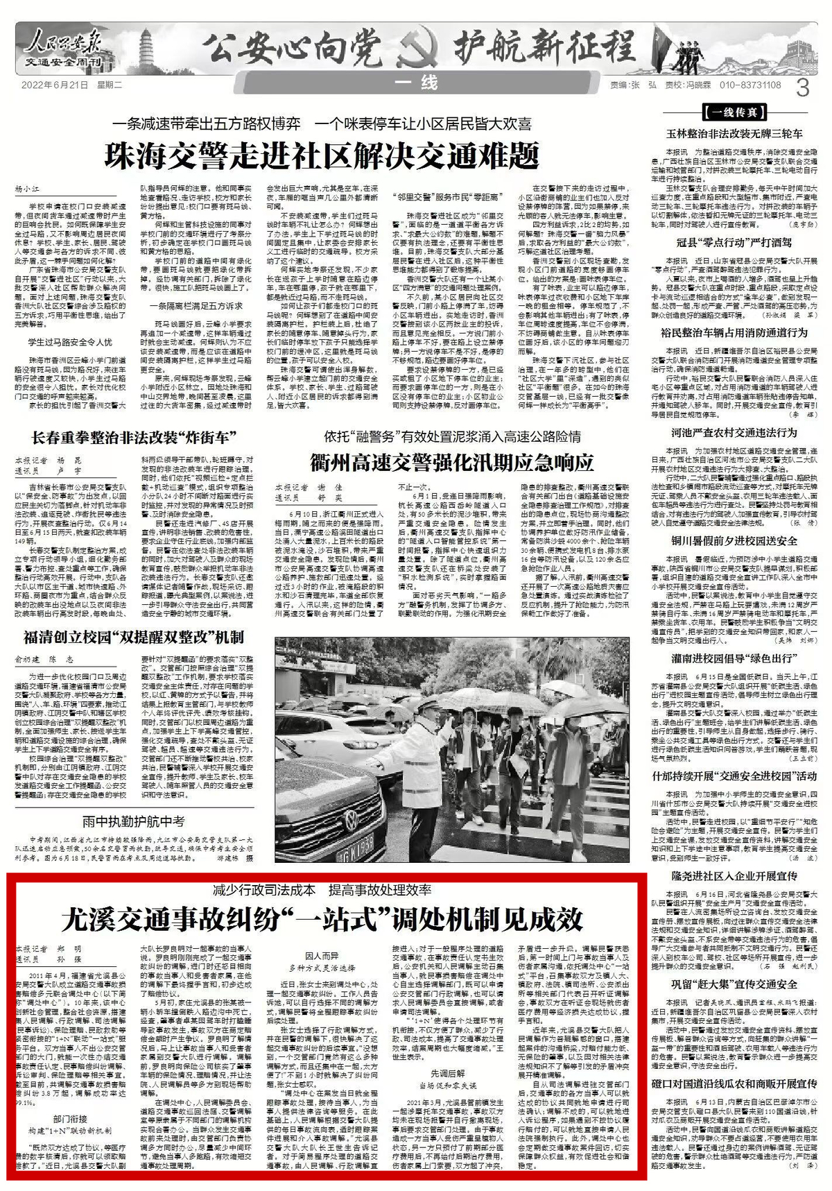2011年4月,福建省尤溪县公安局交警大队成立道路交通事故损害赔偿多元联合调处中心(以下简称“调处中心”)。10年来,该中心创新社会管理,整合社会资源,搭建集人民调解、行政调解、司法调解(民事诉讼)、保险理赔、民政救助等紧密衔接的“1+N”联动“一站式”服务平台。双方当事人不出公安交管部门的大门,就能一次性办结交通事故责任认定、民事赔偿纠纷调解、诉讼审判、保险理赔等相关事宜。截至目前,共调解交通事故损害赔偿纠纷3.8万起,调解成功率达99.1%。