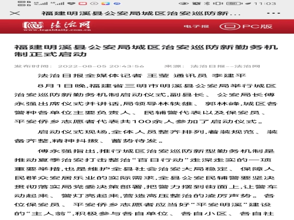 傅永强指出,推行城区治安巡防新型勤务机制是推动夏季治安打击整治“百日行动”走深走实的一项重要举措,也是维护全县社会治安大局稳定、保障人民群众安居乐业的实际需求,全县公安民辅警要坚决贯彻落实局党委决策部署,把警力摆到街面上,让警车动起来、警灯亮起来,营造高压整治的凌厉声势。各位保安员、平安侨乡志愿者应当好“平安明溪”建设的“主人翁”,积极参与各自单位、各自小区、各自社区的治安巡防,共创平安环境、共建美好家园。