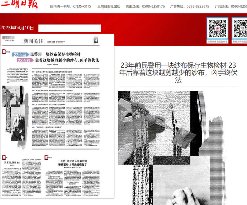 23年前,永安市不到一年内发生两起命案。短时间内两位年轻女性被害,永安城内人心惶惶。然而,限于当时的技术条件,这两起命案久侦未破。凶手是谁?多年来,公安机关始终没有放弃对该案的侦破工作。2020年云剑行动开展后,永安市公安局再次启动命案积案的侦破工作。在省、市公安机关的大力支持下,经过对该案的重新梳理和细致排查,一块纱布保存的生物检材随着刑事科学技术发展让真相浮出水面……