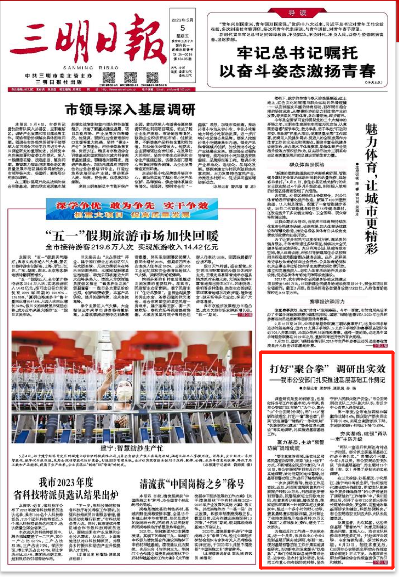“三沙永、将建泰……”调查研究是党的传家宝,也是做好各项工作的基本功。今年以来,我市公安部门坚持系统观念和强基导向,以市局“1”为中心,聚合“12”个公安局(分局),用“1+12”捆绑作战理念,打出一套“聚合拳”。同时,充分用好调查研究这个“传家宝”,组织全市公安机关开展“政治建警”“情指行一体化机制”“执法规范化建设”“警务信息化建设”等实地调研,广泛收集基层公安诉求和意见建议,入户走访群众1.2万余户,深入基层一线了解实情,“基”发调研出实效。