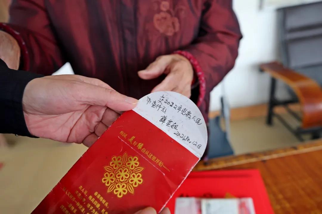 1月21日,三明市公安局机关党委和离退休党总支在春节前夕慰问97岁的市局退休民警薛金姐时,她颤颤巍巍从口袋里拿出一个红色纸袋,里面装着1000元钱。