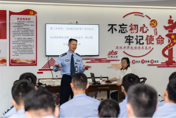 读书分享会在《雨点变奏曲》和《蜈蚣赛跑》两个破冰游戏中拉开序幕,营造宽松氛围;与会青年一一自我介绍,分享喜欢的游戏、书籍、励志歌曲、从警初心以及一件最值得骄傲的事,增进彼此了解,密切同事关系;市公安局交警支队纪委书记陈孟林结合自身经历,分享读书心得,建议广大青年民警加强工作统筹管理,进一步改进提升工作效率。