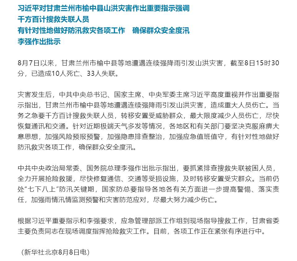 习近平对甘肃兰州市榆中县山洪灾害作出重要指示
