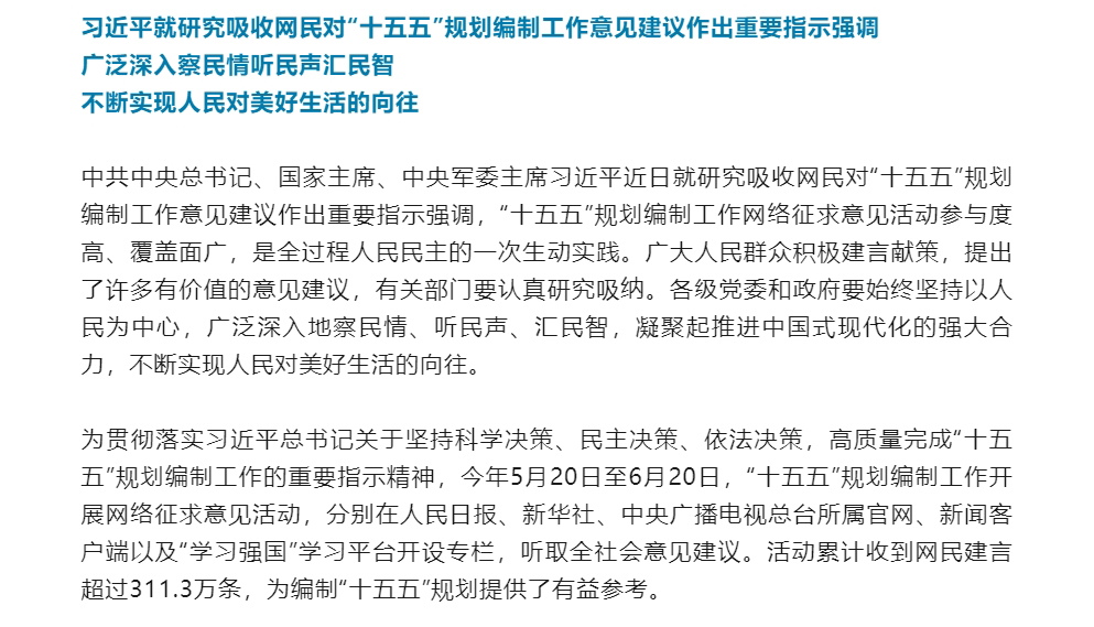 习近平就研究吸收网民对“十五五”规划编制工作意见建议作出重要指示