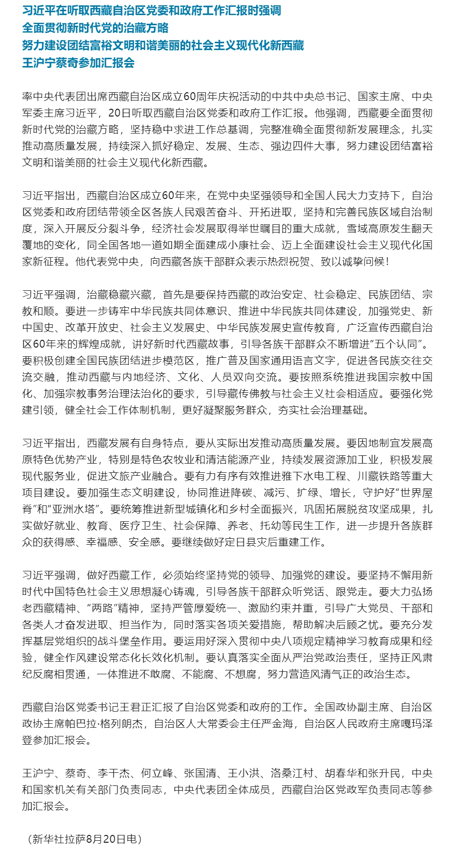 习近平:全面贯彻新时代党的治藏方略 努力建设团结富裕文明和谐美丽的社会主义现代化新西藏