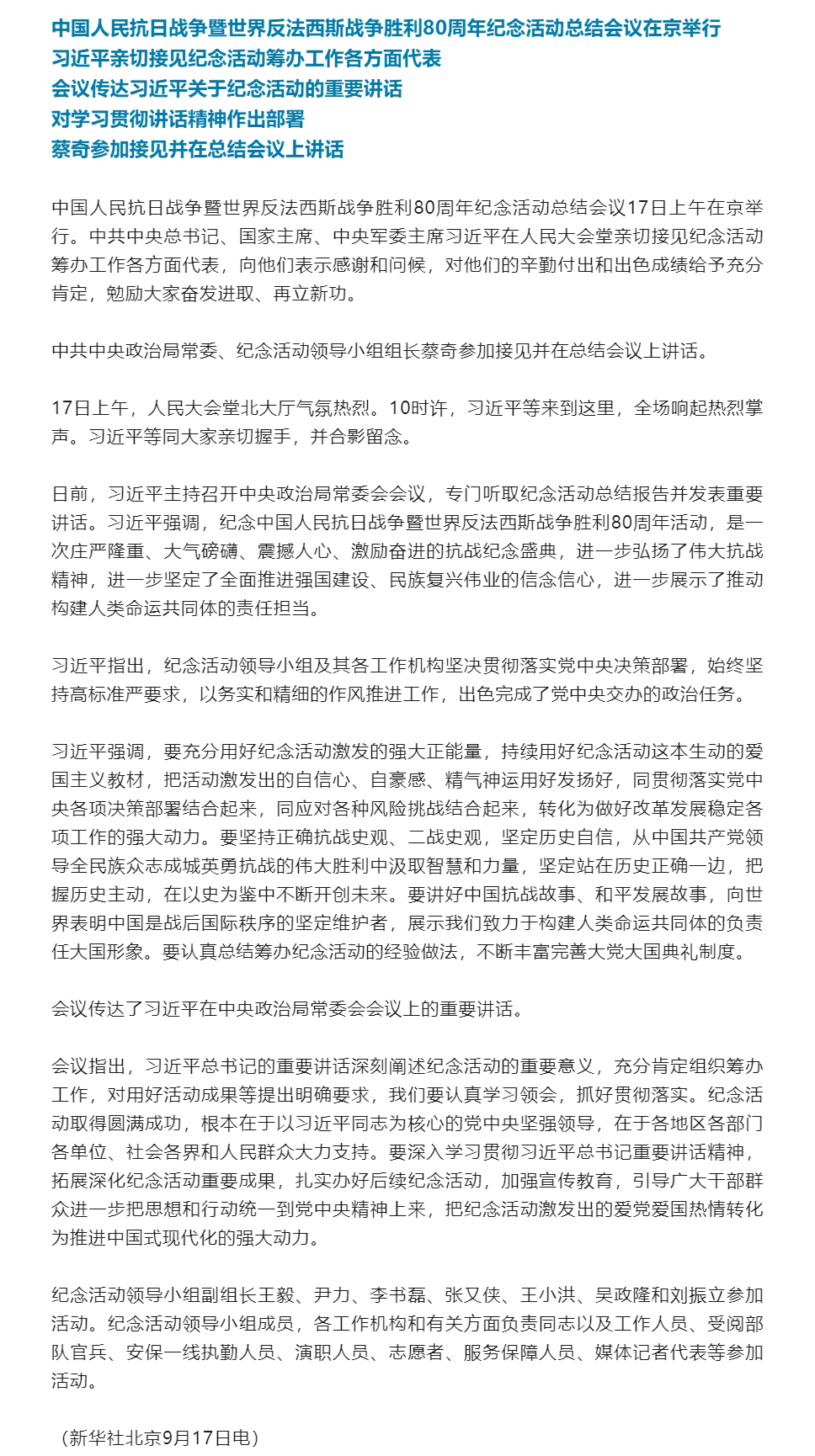 中国人民抗日战争暨世界反法西斯战争胜利80周年纪念活动总结会议在京举行 习近平亲切接见纪念活动筹办工作各方面代表