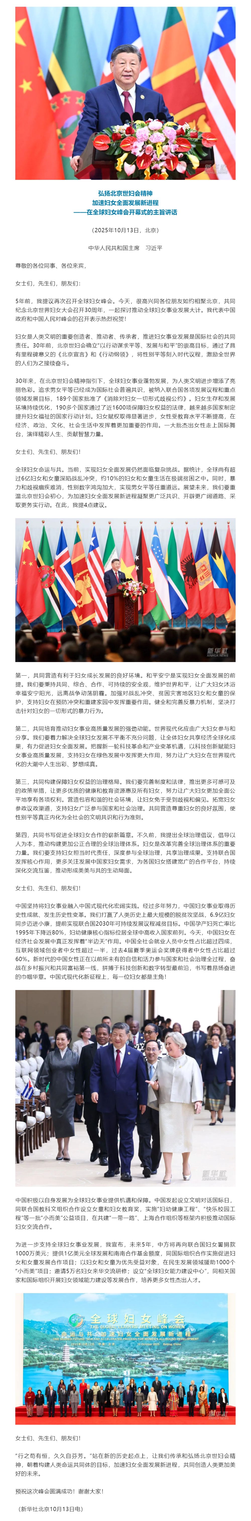 习近平在全球妇女峰会开幕式的主旨讲话(全文)