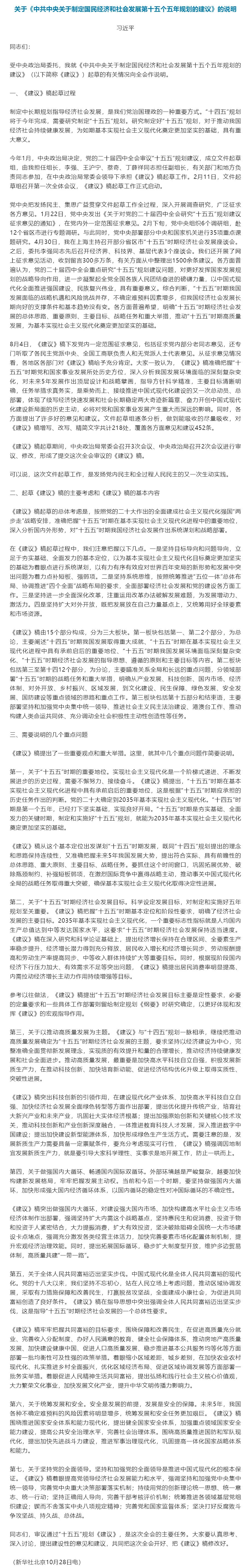 习近平:关于《中共中央关于制定国民经济和社会发展第十五个五年规划的建议》的说明