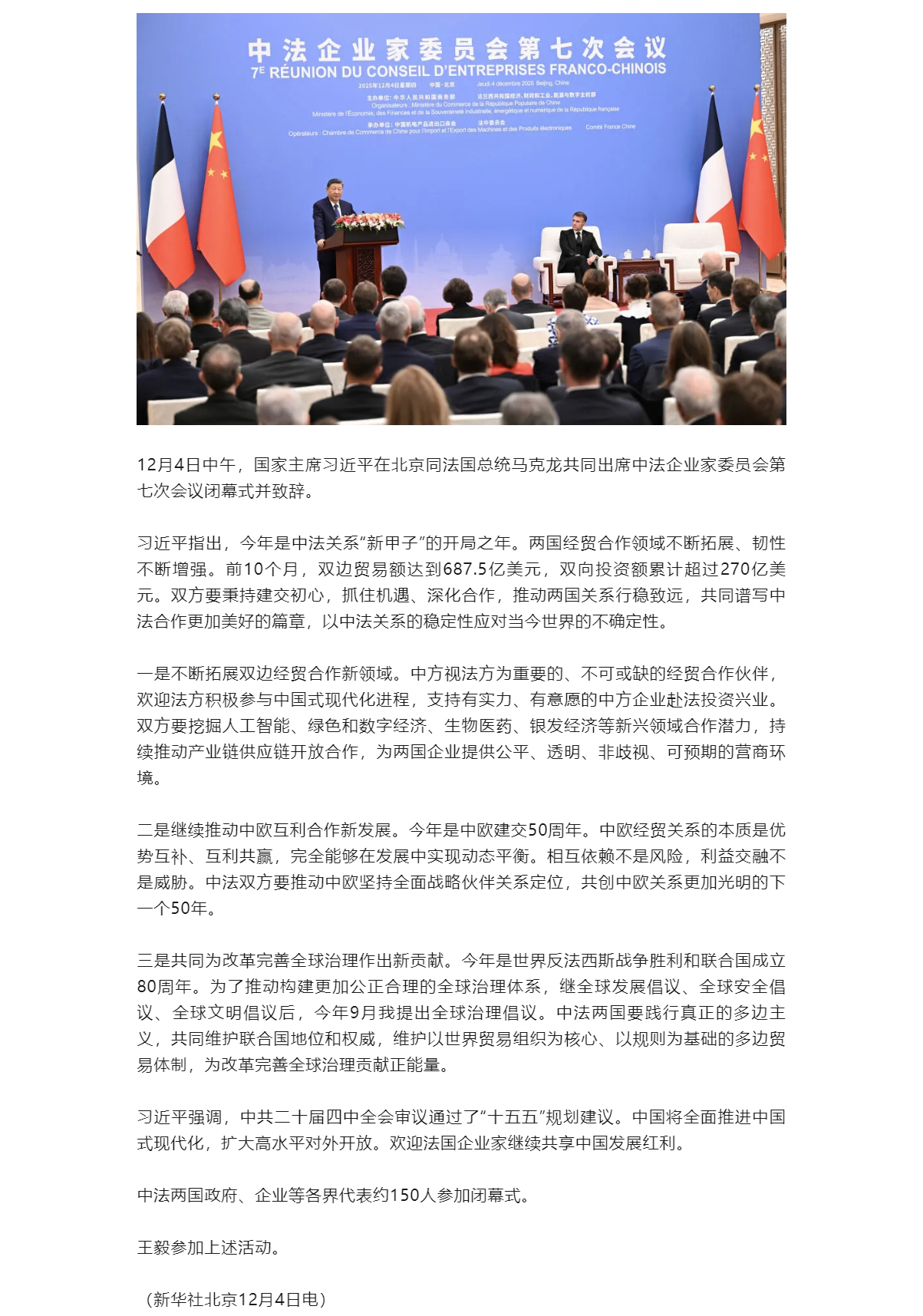 习近平出席中法企业家委员会第七次会议闭幕式并致辞