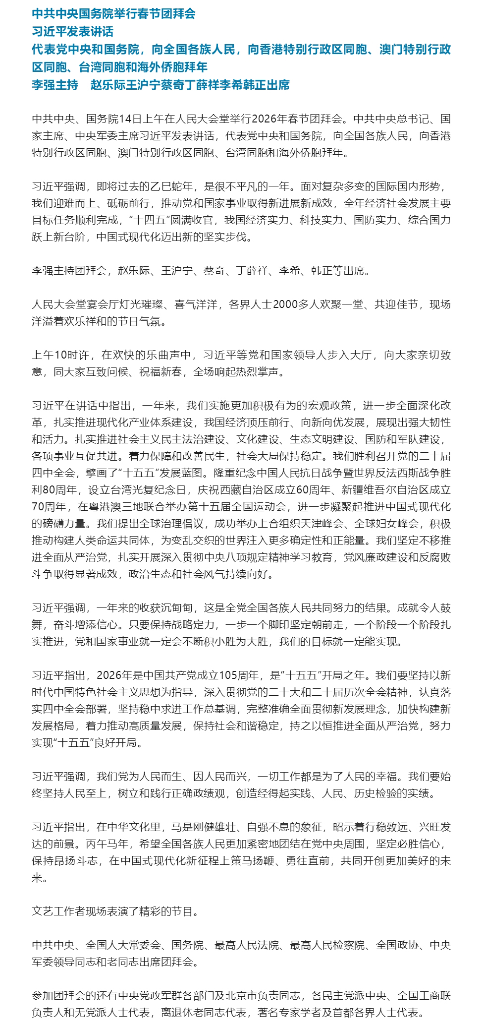 中共中央国务院举行春节团拜会 习近平发表讲话